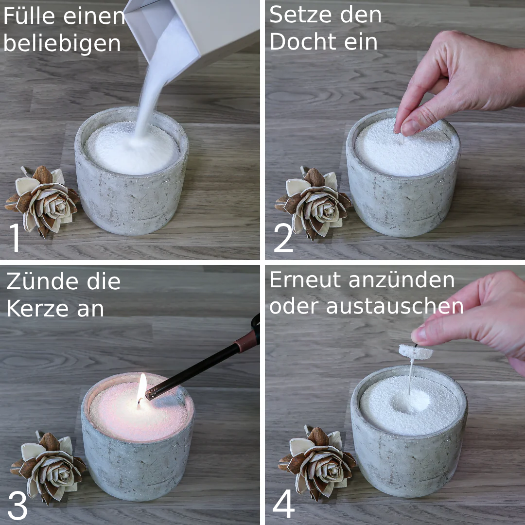 Mit den Aura Candles Sandkerzen können Sie Ihre Lieblingsschale in eine wunderschöne Kerze verwandeln. Füllen Sie die Vase mit unserem Sandwachs, wählen Sie einen oder mehrere Dochte und erschaffen Sie eine einzigartige, persönliche Lichtquelle, die perfekt zu Ihrem Zuhause passt.